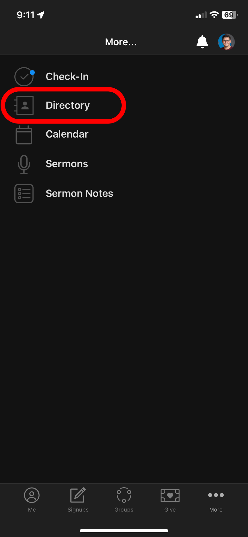 Church Center is available as a website and as an app and is a great place to connect with the life of our church, including a directory with a way to get in touch with other attenders. To get to the directory, click More in the menu bar and then click Directory.