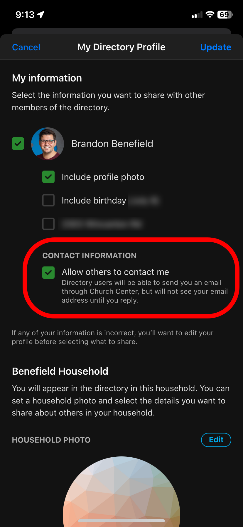 Within your directory profile, you’ll be able to choose exactly what personal and household information you’d like to share. You can choose which household members to include, whether or not to display your profile photo, your birthday (just the day, not the year), and home address.